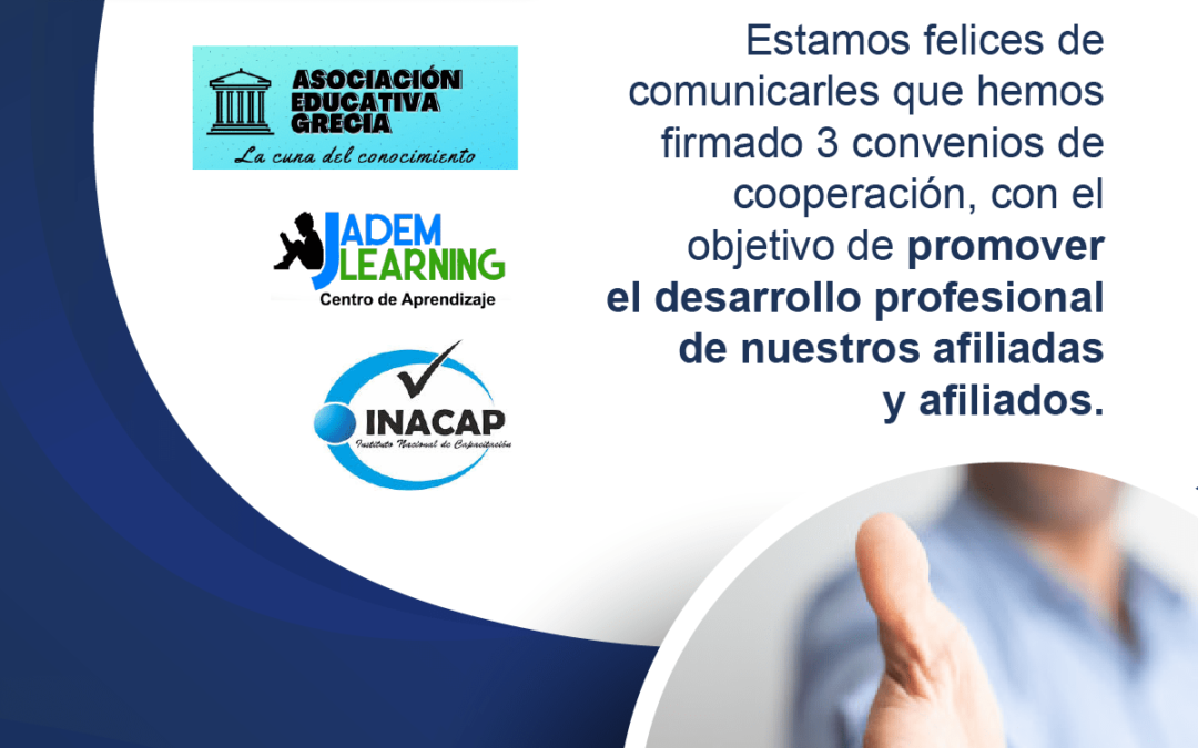 CPPe firma 3 nuevos Convenios de Cooperación Con el objetivo de promover el desarrollo profesional de nuestros afiliadas y afiliados, el CPPe ha firmado 3 nuevos Convenios de Cooperación con la Asociación Educativa Grecia, Jadem Learning Centro de Aprendizaje y el...