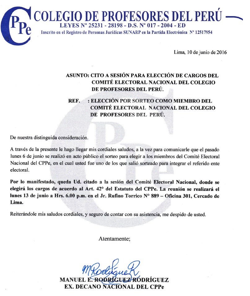 PROFESORES INTEGRANTES DEL COMITÉ ELECTORAL NACIONAL DEL CPPe, SORTEADOS EN ACTO PÚBLICO EL 06/06/2016