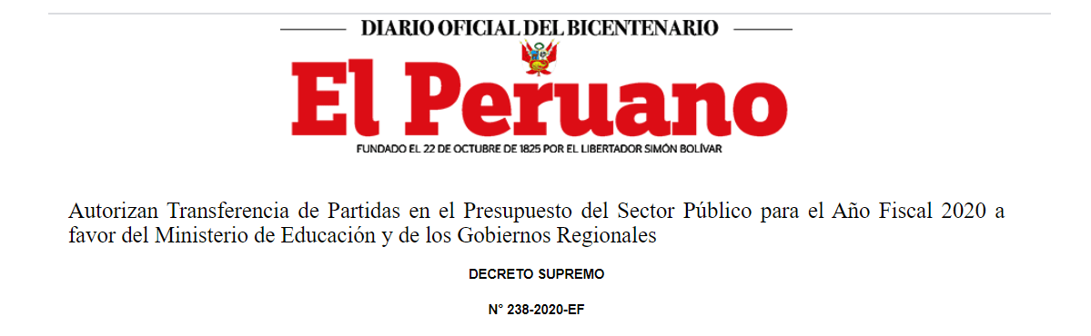 Casi después de 4 meses, recién con fecha 24 de agosto, el Ministerio de Economía y Finanzas autorizó la transferencia de “Partidas en el Presupuesto del Sector Público para el Año Fiscal 2020 a favor del Ministerio de Educación y de los Gobiernos Regionales”.